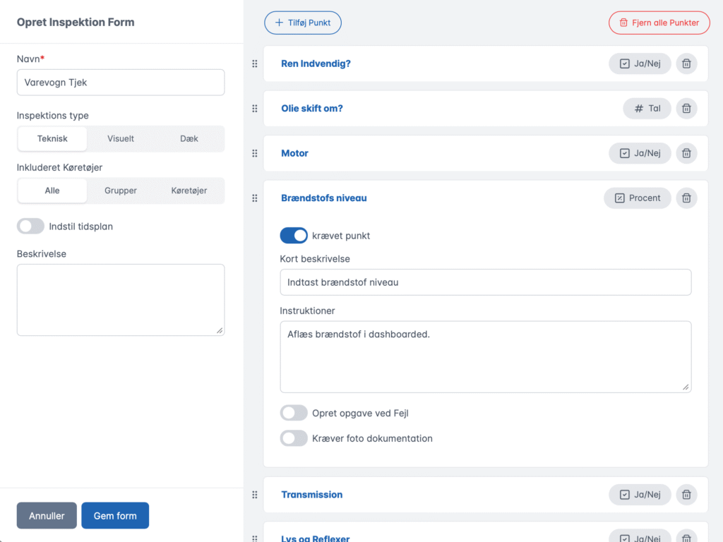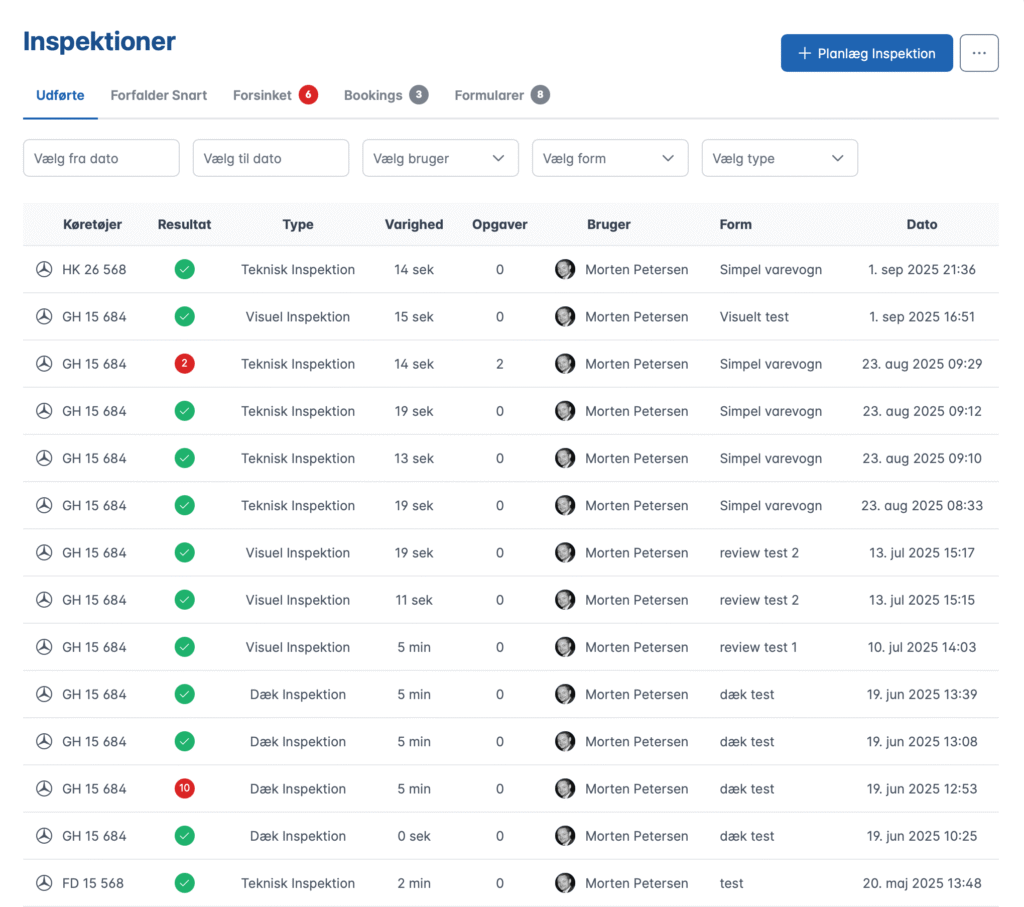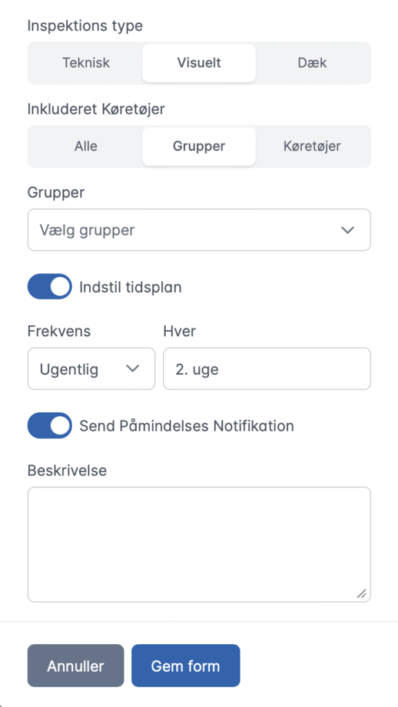 You define inspection schedules (daily, weekly, monthly or yearly) and assign them to specific vehicles, groups or the entire fleet. The system automatically creates inspections based on the schedule and sends notifications to relevant employees when inspections are due.